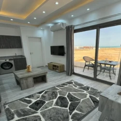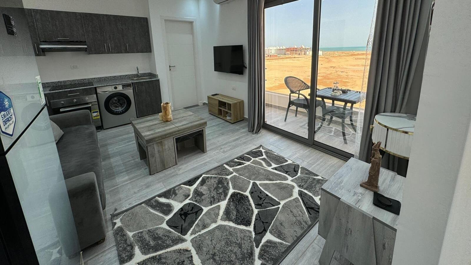 Comfortable Living: Imperial resort in Hurghada offers a one-bedroom apartment with a balcony, air-conditioning, and a fully equipped kitchen. The living room includes a TV and a washing machine, ensuring a pleasant stay.
